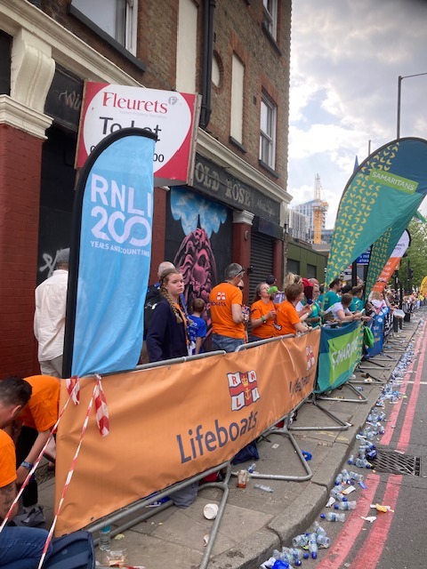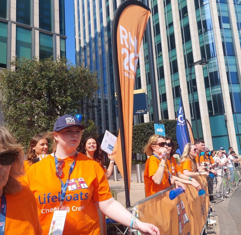 83 people running for the RNLI at the London Marathon raised over £87,000 -- cheered on their way by Faringdon branch members at two of four special RNLI cheer-stations dotted round the course.